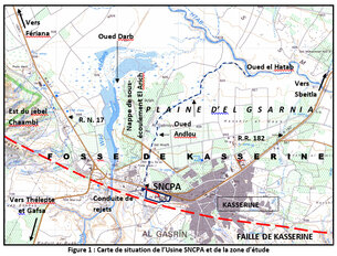Notez dans ce contexte, les routes nationale n°17 et régionale n°182, la faille bordière Sud du fossé d’effondrement de Kasserine, le site de la SNCPA et sa conduite de rejet, l’oued Andlou accueillant ces rejets, la plaine d’El Gsarnia et la situation de la nappe de sous-écoulement d’El Arich, le réseau hydrographique : oueds Andlou Ed Darb et El Htab, qui conduit vers la plaine de Sidi Bouzid plus à l’Est